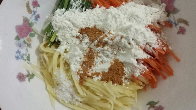 6. 胡萝卜丝、土豆丝、香葱节、鸡蛋液放到一个大碗里