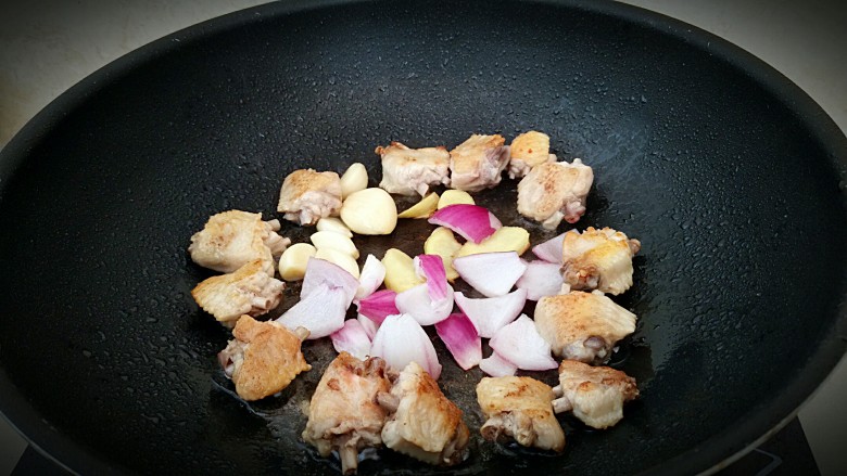 9. 放入洋葱,姜片,大蒜和鸡翅一起煎至出味。