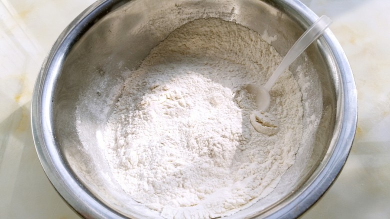 1. 面粉中加入1克盐,1克食用碱拌匀。