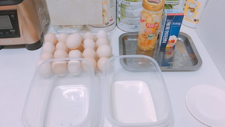 2. 蛋黄和蛋清分离,蛋黄里加入牛奶,色拉油,搅拌均匀。蛋清加入白糖(分2次加入)