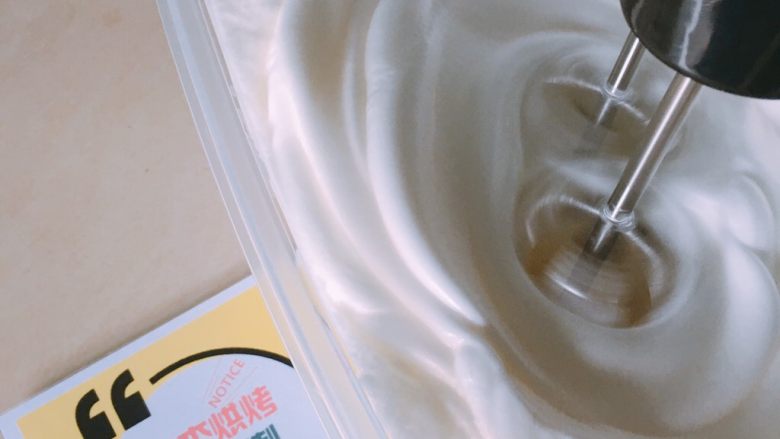3. 用电动打蛋器直接开到高速打发蛋清,打到泛白,倒扣不掉落为理想,放一边备用