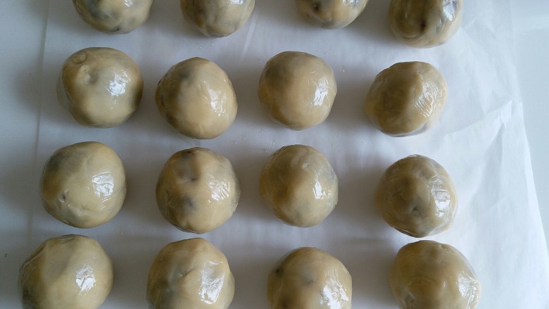 8. 松弛面团时把豆沙馅儿准备好,每个44克搓成小圆球