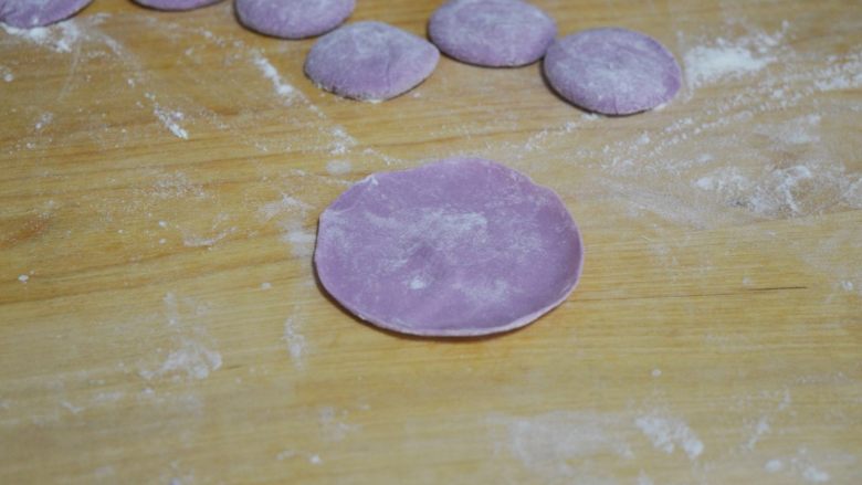 8. 紫薯和面粉,加水和成紫色的面团,盖好松弛一下