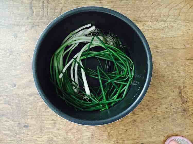 4. 把小香葱铺在电压力锅的锅底