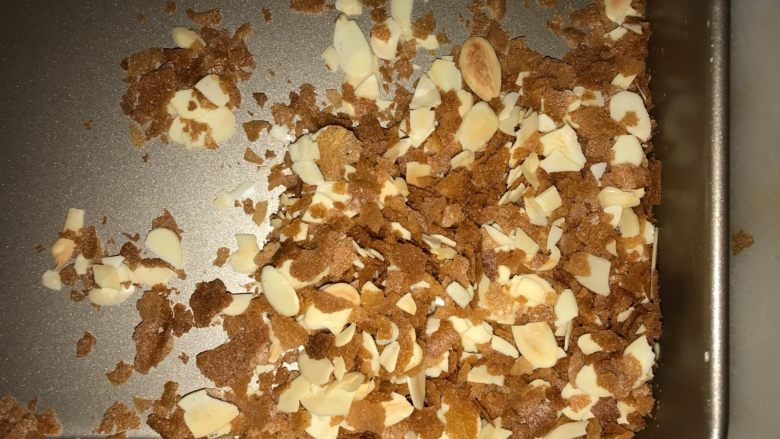 24. 杏仁片放入150度烤箱烤10分,中途注意观察颜色,翻动杏仁片,出炉后和可可薄脆拌匀压碎