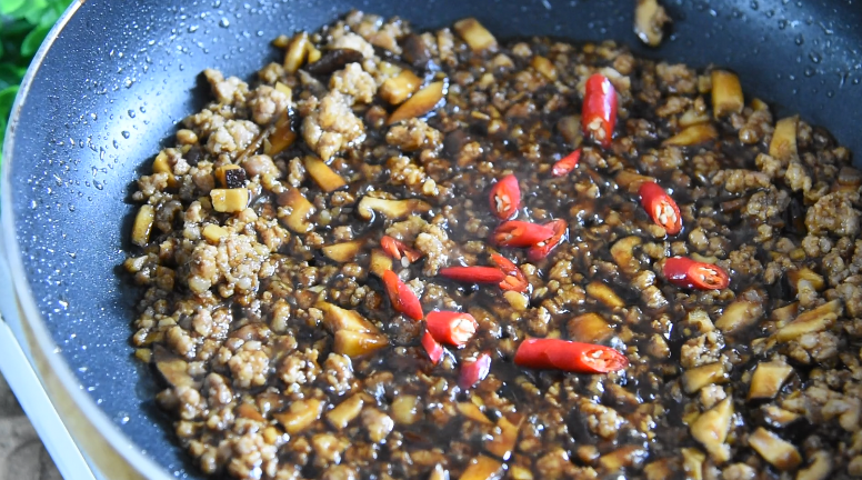 8. 再倒入蒜姜末、香菇末翻炒,炒匀后倒入15g蚝油