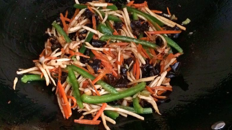 1. 胡萝卜,青椒,茭白笋,黑木耳分别切丝备用。