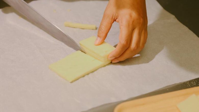 8. 粘米粉过筛,加入蛋黄液中,继续搅拌