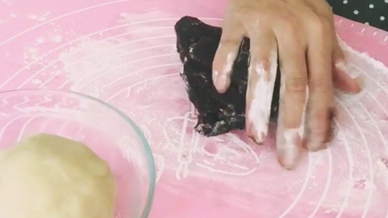 1. 把牛奶桃山皮和抹茶桃山皮分别揉搓均匀,多揉一会,让桃山皮更有延展性。