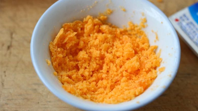 2. 咸蛋黄碾碎备用。