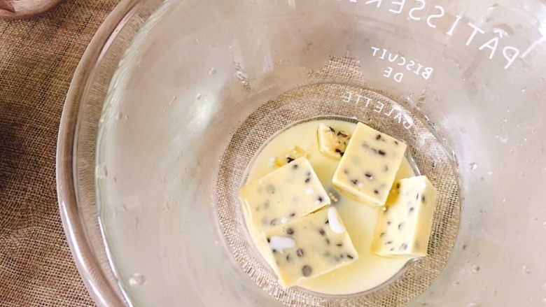 6. 倒入之前融化的白巧克力糊,继续切拌均匀。