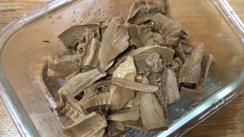 4. 泡发好的香菇挤干水分,去蒂切小段。