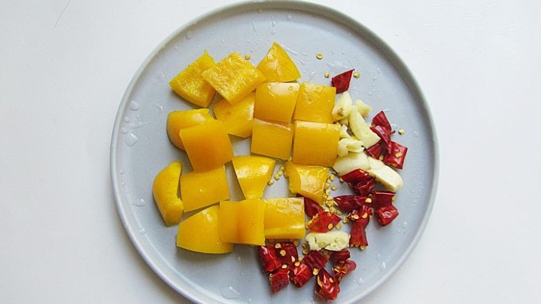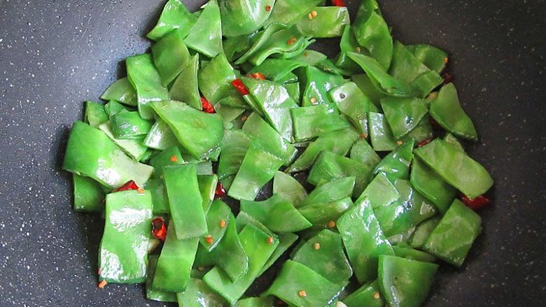 7. 倒入红干椒、蒜碎炝几秒钟