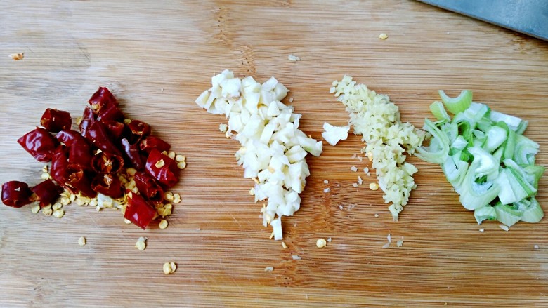 9. 待油七分热时放入葱姜蒜和干辣椒爆香。