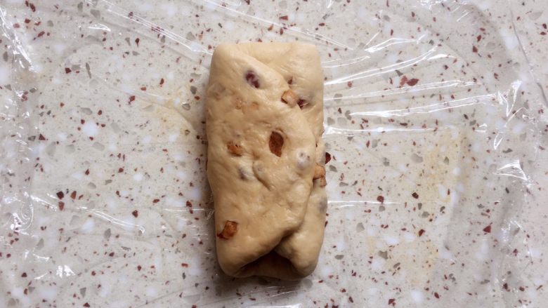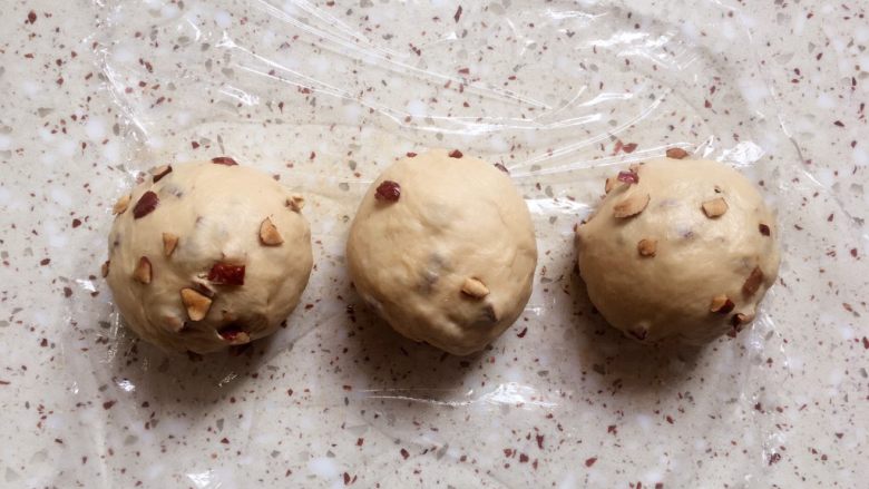 16. 发酵好的面团排气后加入红枣颗粒,分成大小一致的3等份;