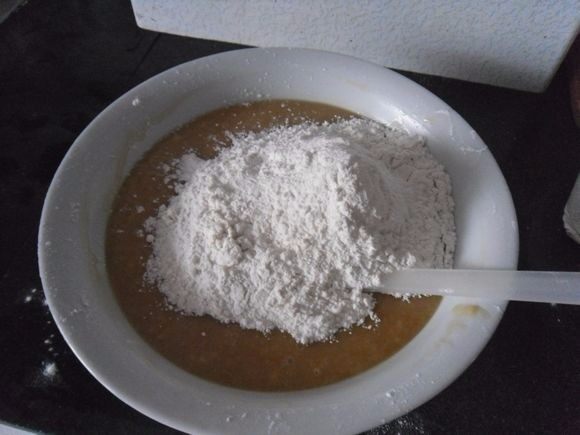 2. 转化糖浆加入碱水,搅打均匀。一定要均匀。再加入玉米油搅拌均匀