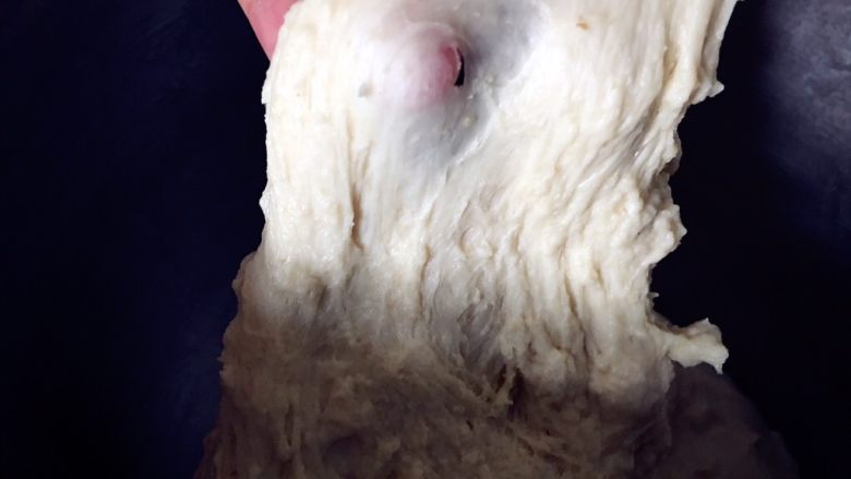 8. 搅拌到完全扩展阶段,可以拉出手套薄膜的阶段。此时面团温度26°C