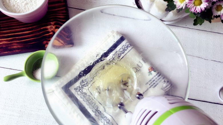 3. 打发至湿性发泡,提起打蛋器,尖角成弯钩状
