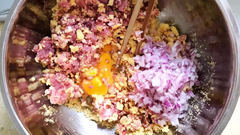 4. 搅拌好的样子,均匀即可,不必搅拌上劲,因为有面包糠的加入,肉馅料比较松散