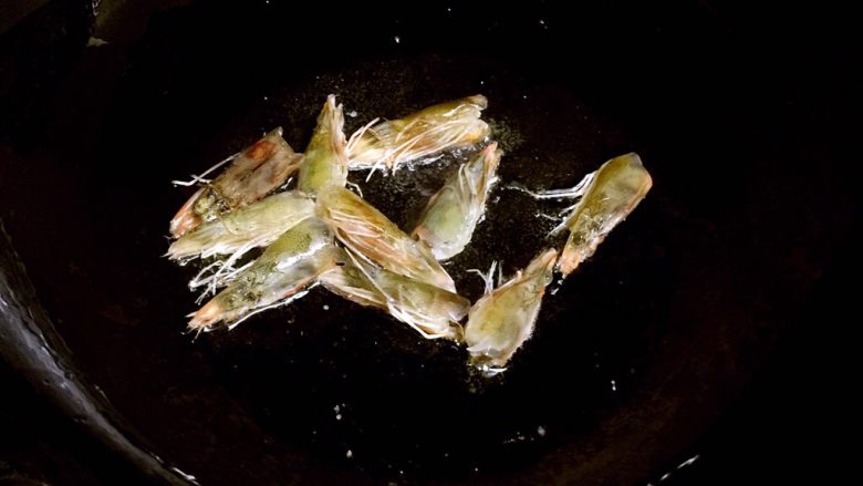 7. 熬虾油:炒锅倒入多一些的植物油,放入虾头,小火煎炸。
