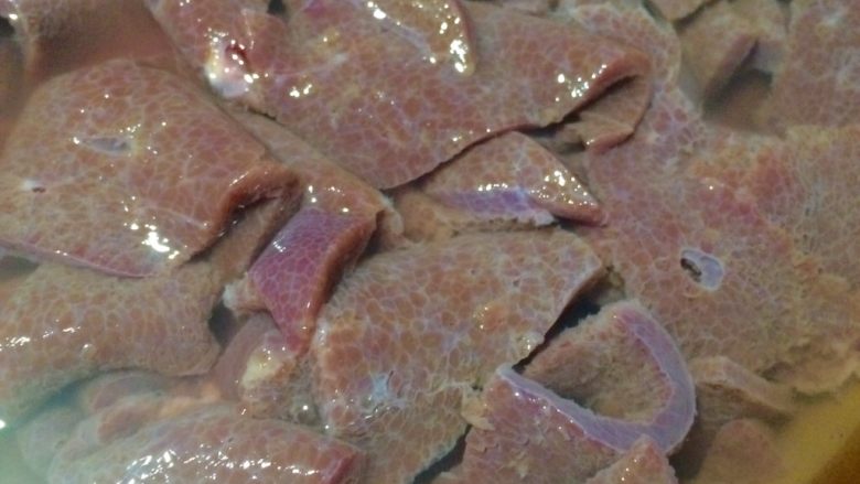 2. 切好的猪肝用清水泡半小时,中间换四五次水 吧猪肝上的粘的颗粒泡下来。