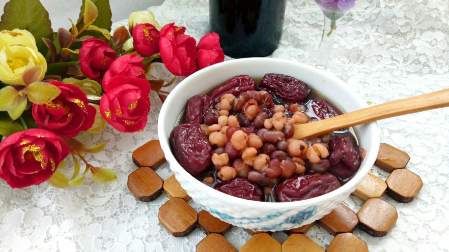 - 红豆不好煮熟,一定要先在高压锅里先煮10分钟。桂圆和大枣先泡5分钟,这样煮起来,更营养均衡。