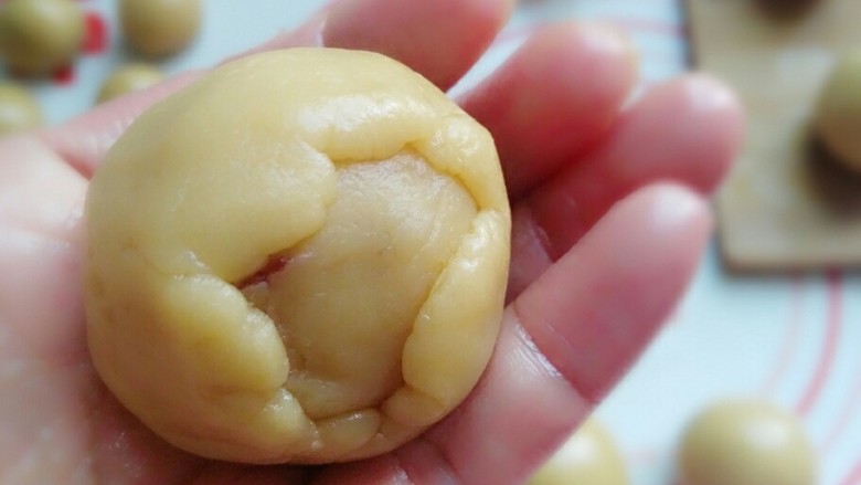 18. 取一份饼皮压扁,再放入馅料包起来,用虎口小心的把饼皮向上推压包紧,整理好收口处不能有缝隙,然后搓圆;