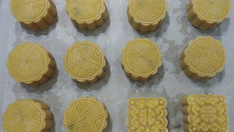 22. 依次压制完所有月饼胚,表面喷微量清水,再放入预热好的烤箱先烤4~5分钟定型;