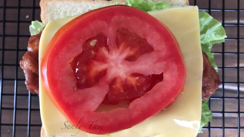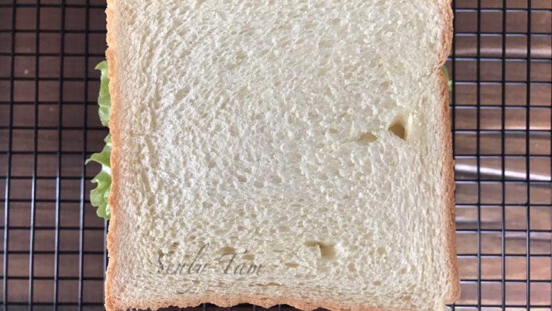 6. 拿一片烤好的吐司片放在烤网上,放上一叶生菜。