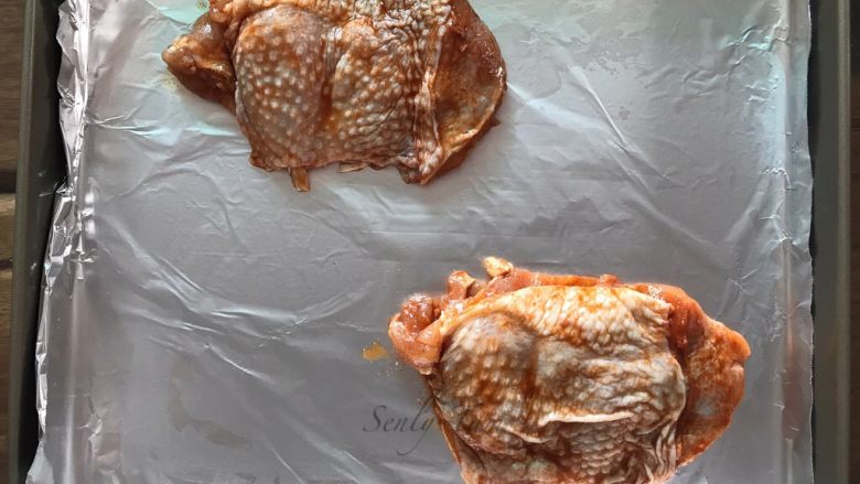 4. 把腌制好的鸡腿放在垫了锡纸的烤盘上,放入预热好的烤箱,中层,200度,25分钟。
