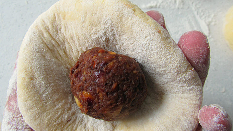 9. 包入馅料撮成馒头形状,馅料冻半硬半软状态较容易包