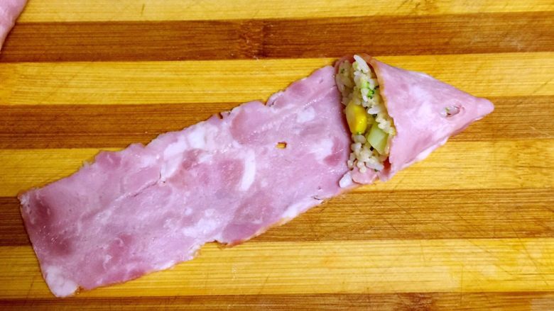 3. 取一片培根放在案板上,一端卷出三角形状。类似包粽子的样子。