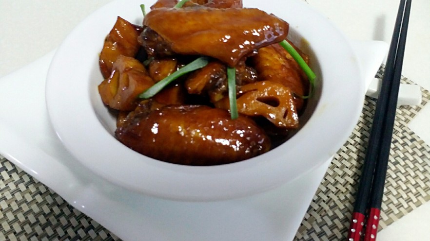 前天买了一节莲藕做藕饼用了一半,还剩下这半截。再不吃就担心坏了,所以就想这半截怎么吃啊?想起来冰柜里还有鸡翅,何不用鸡翅和莲藕一起搭配吃也应该不错,于是翻出来鸡翅解冻。用红酒来烧鸡翅莲藕,味道一定很好。我不喜欢吃鸡所以鸡翅给老公吃,我吃莲藕老公牙不好吃不了硬的东西真是各有所需啊!