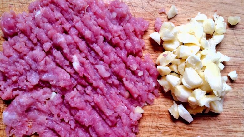 8. 锅内留少许油,蒜爆香,倒入肉末翻炒。