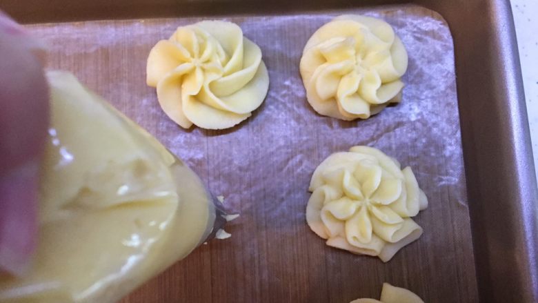 25. 裱花袋剪开一个合适尺寸的小口,面糊推到最前端,准备好烤盘,铺油布或者油纸