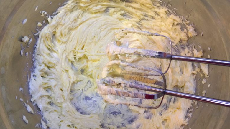10. 淡奶油从冰箱取出放置2小时以上再使用,分三至四次加入黄油中,搅打均匀后再加下一次,