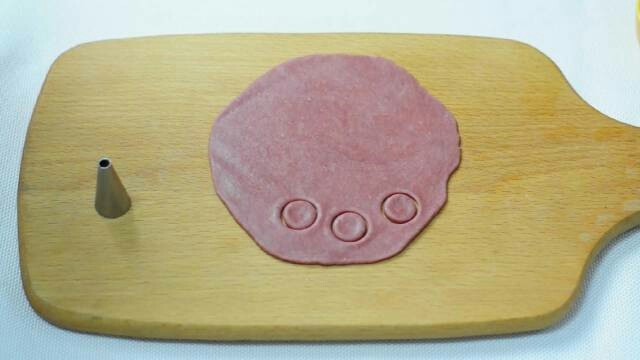 13. 红色面团擀成饼,用裱花嘴压出耳朵和鼻子