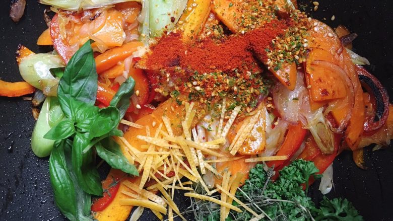 9. 炒香后加入香草。