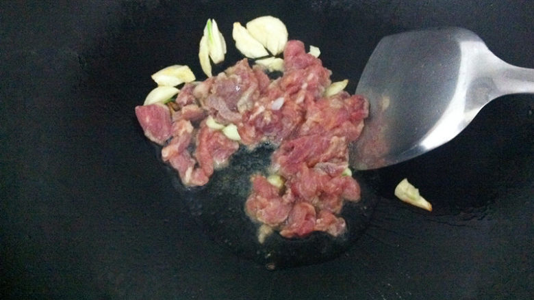7. 炒至肉片发白,香味溢出,倒入适量清水