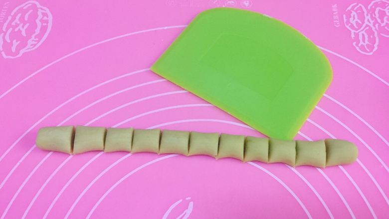 9. 取一半的红薯面团,搓成长条,用刮板切成大小适中的段。