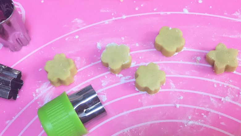 11. 另一半红薯面团压成饼状,用模具压出花朵形状。同样的,紫薯面团也同样做好。