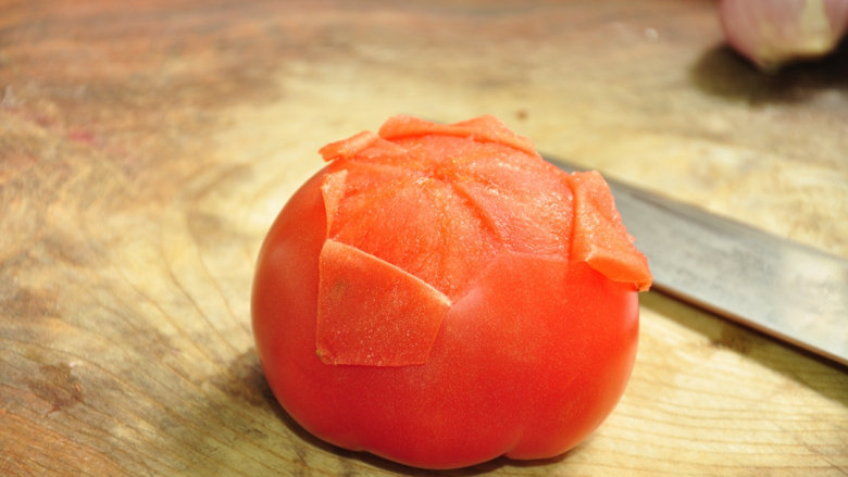2. 西红柿顶部切“十字”刀,入开水中烫一下,去除外皮。