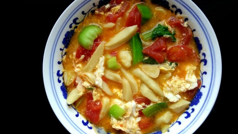 早餐越简单越省事越好,但是也要营养搭配均衡。西红柿,油菜,鸡蛋,葱蒜,面茧混合在一起,倒入蓝花碗,可谓五颜六色。营养均衡,简单省事。