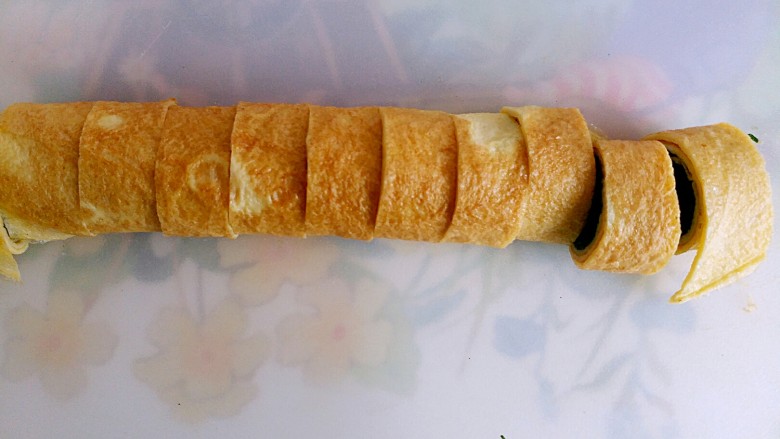 11. 卷成菠菜卷,一定要卷紧实点。防止切段的时候散开。