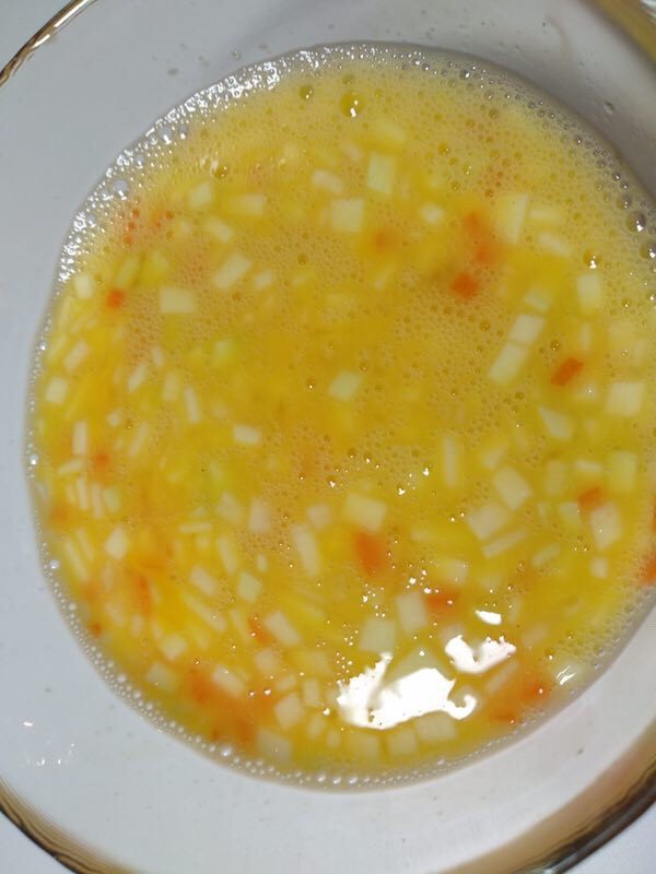 3. 蛋液中放入胡萝卜丁,西葫芦丁和少许香菇粉