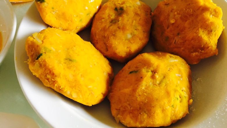 6. 把搅拌好的南瓜馅、做成南瓜饼