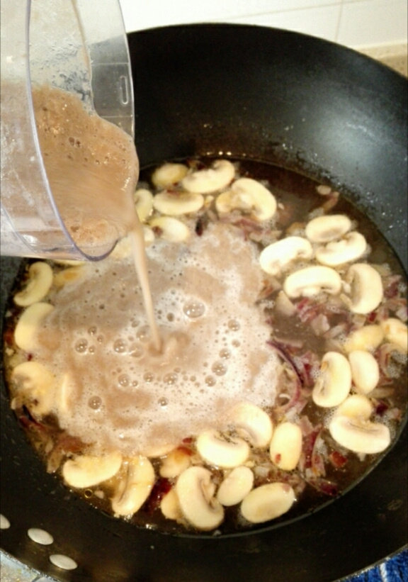 5. 倒入打碎的蘑菇泥,