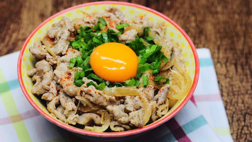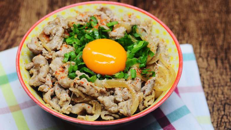 14. 其他吃法,可在飯上舖上一層製做完成的薑汁燒肉,灑上蔥花及生蛋黃後,日式薑汁丼飯簡單完成