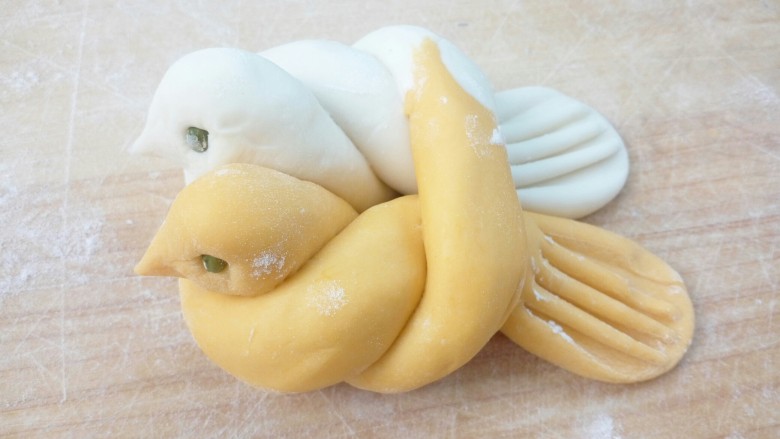 12. 剪刀剪出羽毛,都做好后盖布醒发到2倍大后,锅开后放蒸篦上蒸20分钟,再焖5分钟