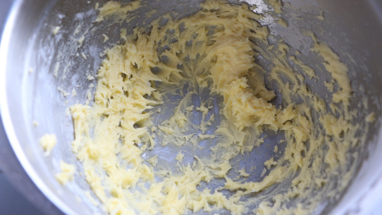 2. 软化的黄油,加入糖粉,用电动打蛋器先低速后中速搅打,直至黄油色泽变浅,体积膨大一倍。打发好的黄油色泽浅白,质地光滑细腻,如羽毛般蓬松。